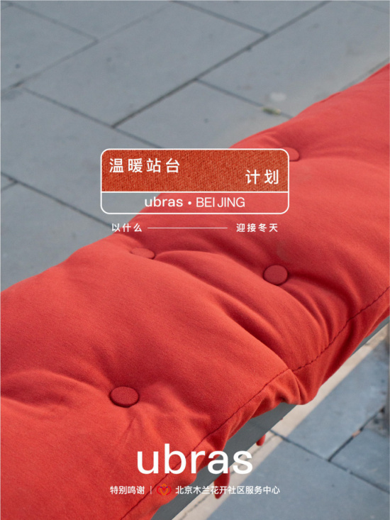 在温度骤降的寒冷秋冬来临之际,ubras联合北京木兰花开社区服务中心开启温暖站台计划,给室外的公交站台穿上肌底衣,包裹住一些座椅和倚靠的杆子,使得其不必完全暴露在外,市民们也能在寒冷的天气有一个休息的余地,不用经受透心凉的感觉。